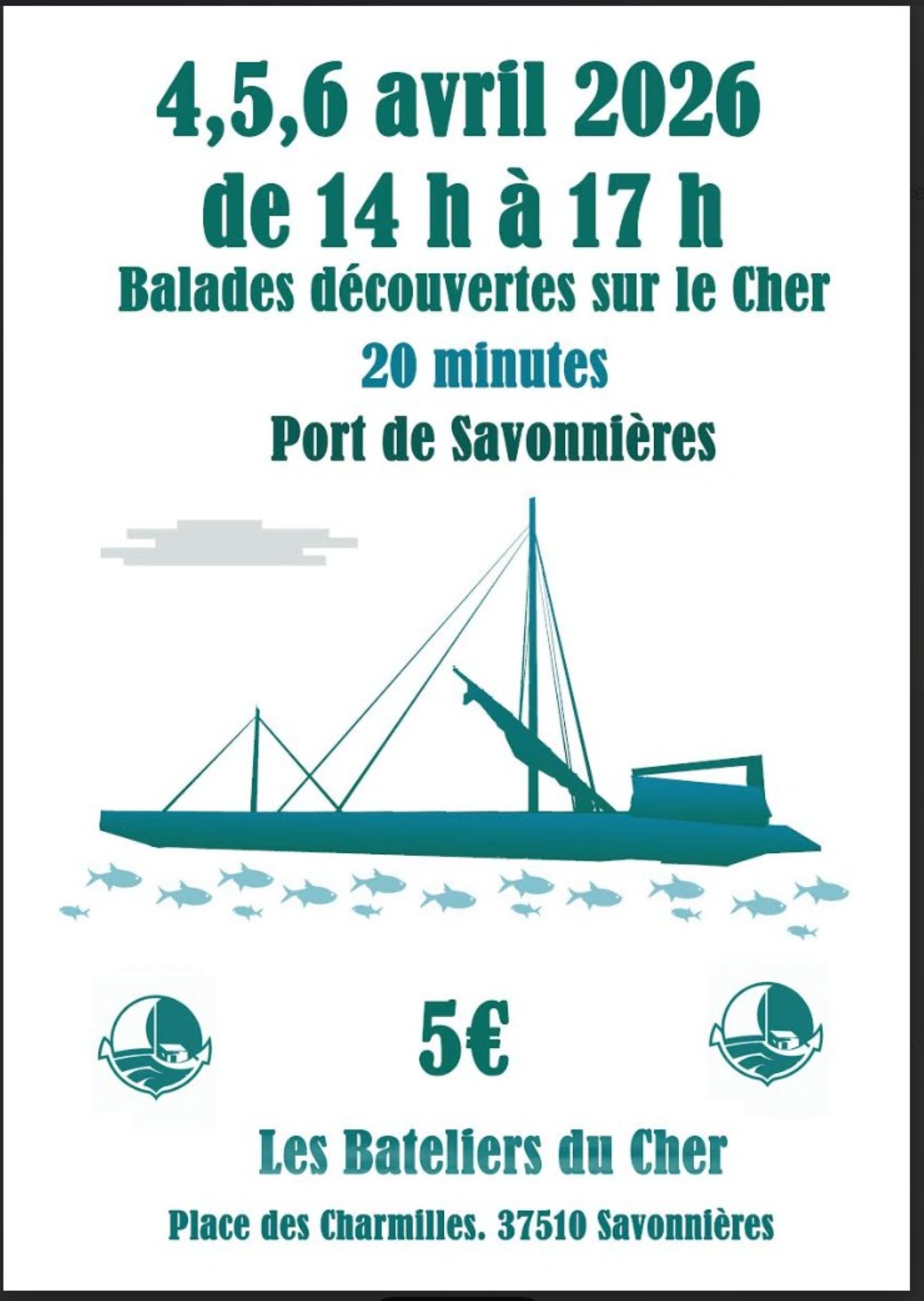 Fil d'ariane Startseite Fêtes et manifestations Balades découvertes sur le Cher PRAKTISCHE INFORMATIONEN Preise Öffnungszeiten Dienstleistungen Verkehrsnetz location_onlokalisieren photo_cameraFotos PRAKTISCHE INFORMATIONEN Preise Öffnungszeiten Dienstleistungen Verkehrsnetz lokalisieren location_on Balades découvertes sur le Cher Impasse des Charmilles Place des charmilles 37510 SAVONNIERES location_on Port de Savonnières Erwachsene, voller Tarif : 5,00 € Kindertarif : 5,00 € Periode (n) Morgen Nachmittag Öffnungszeiten Ruhetag 04/04/2026 - 06/04/2026---- Veranstaltung draußen category Mit öffentlichen Verkehrsmitteln beitreten