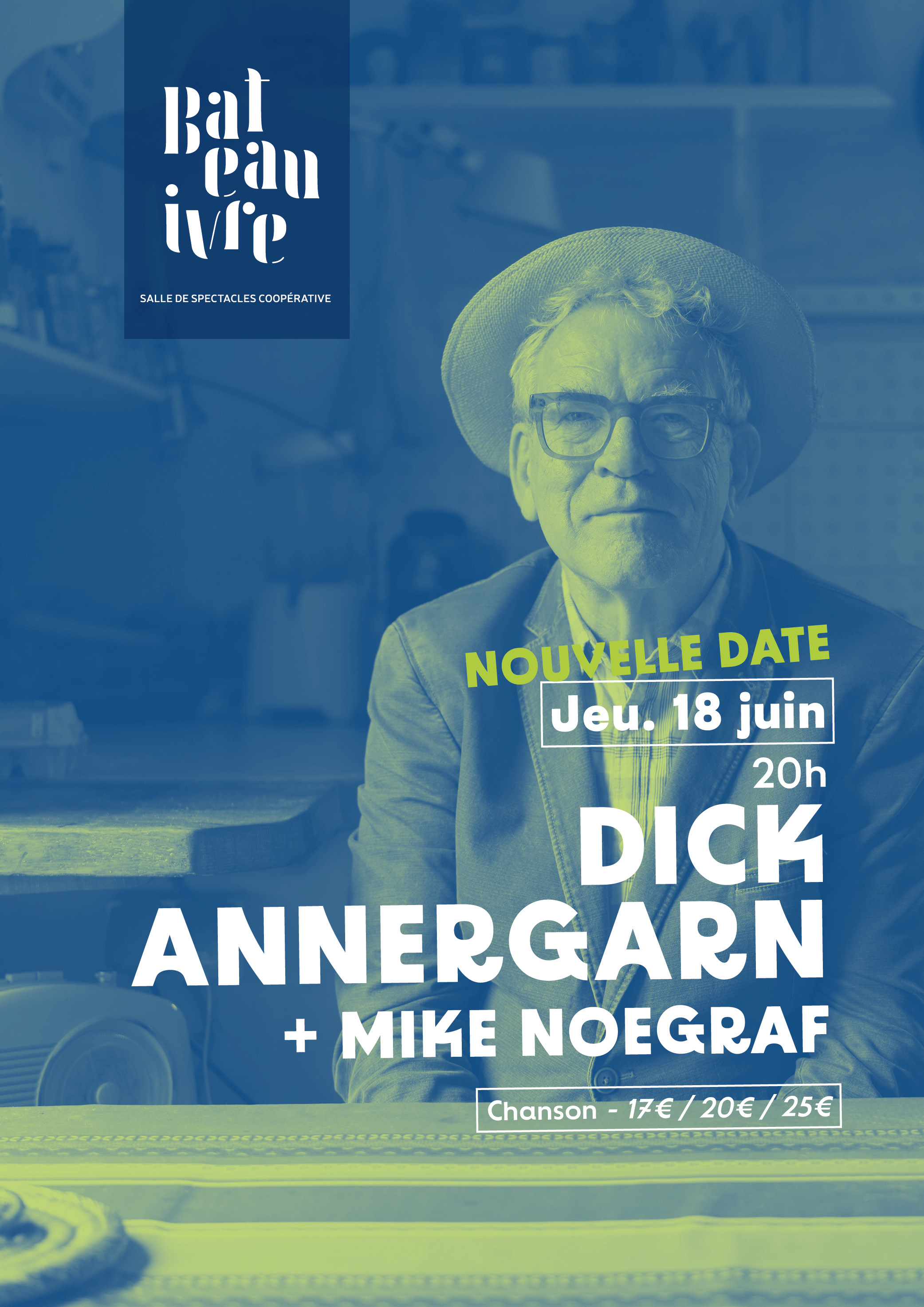 Fil d'ariane Startseite Fêtes et manifestations Dick Annegarn + Mike Noegraf PRAKTISCHE INFORMATIONEN Preise Öffnungszeiten Dienstleistungen Verkehrsnetz location_onlokalisieren photo_cameraFotos PRAKTISCHE INFORMATIONEN Preise Öffnungszeiten Dienstleistungen Verkehrsnetz lokalisieren location_on Dick Annegarn + Mike Noegraf 146 Rue Édouard Vaillant 37000 TOURS location_on Le Bateau ivre search Link anzeigen search https://www.bateauivre.coop/évènements/dick-annegarn-mike-noegraf Ermäßigter Preis : 17,00 € Erwachsene, voller Tarif : 20,00 € Erwachsene, voller Tarif : 25,00 € Periode (n) Morgen Nachmittag Öffnungszeiten Ruhetag 18/06/2026 - 18/06/2026---- Mit öffentlichen Verkehrsmitteln beitreten