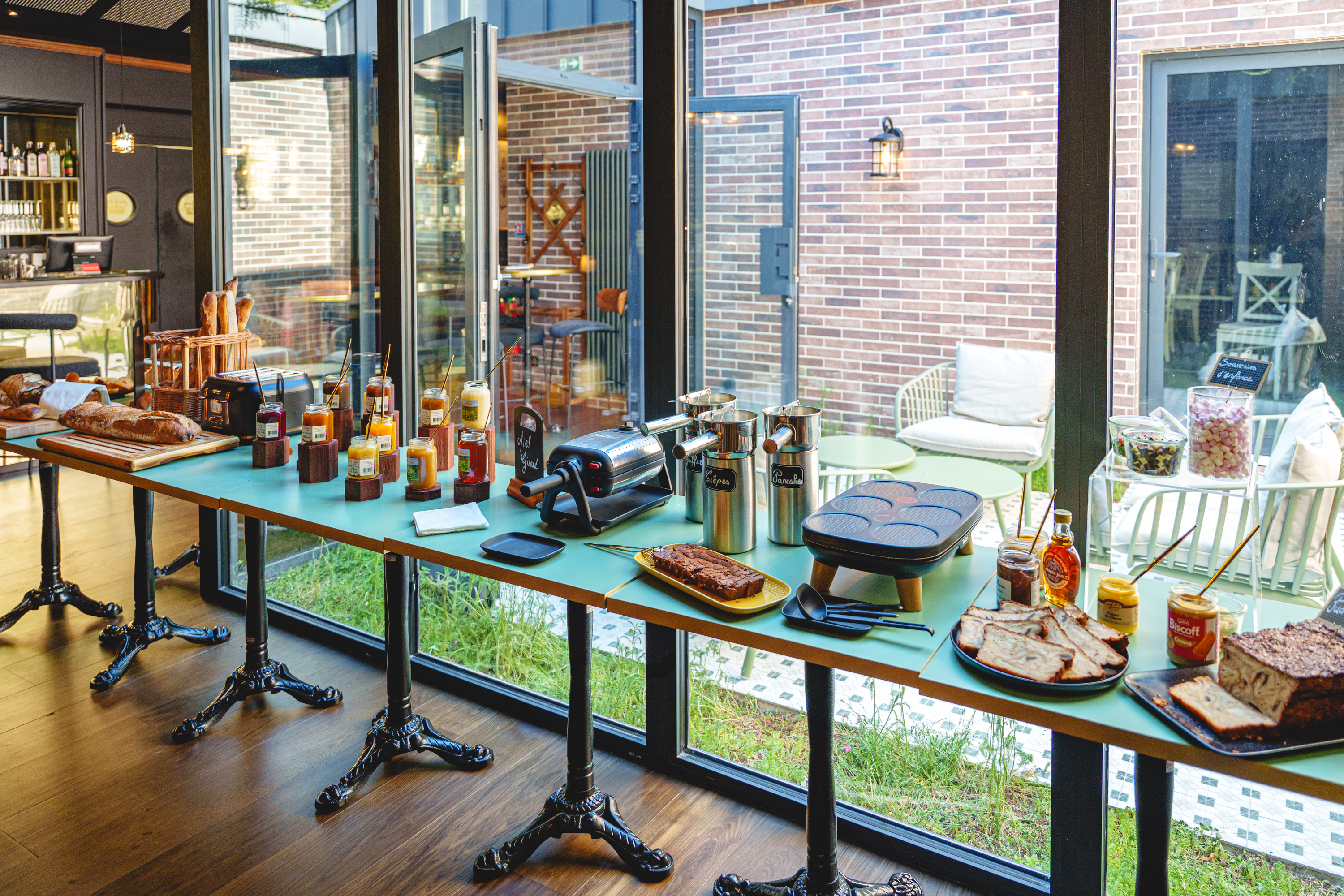 Und wenn Sie noch mehr wollen, finden Sie hier auch : Heißgetränke, Fruchtsäfte und das frische Marktobst von Frau Acaris, Orangen zum Auspressen, frisches Baguette von Joseph, Müsli, darunter 1 glutenfreies Müsli, Trockenfrüchte und Samen, Konfitüren von Délices de Flo, Honig aus dem Haus Girard, Milchprodukte von GAEC Falourd „Terre de lait“ Kompotte, bretonische Butter, eine Lachsplatte und eine hausgemachte Guacamole, eine Wurstplatte, eine Käseplatte, Salat und Tomaten, Pfannkuchen und Crêpes zum Garnieren mit vielen regressiven Leckereien sowie ein hausgemachter Schokoladenfondant.